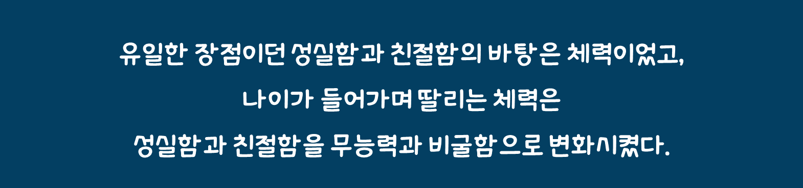시간은 그 차이를 알려주었다. 스타트라인부터 앞선 놈들은 해가 거듭할수록 여유가 생겼고 능력과 돈을 축적할 수 있었다. 반면 이제 경만은 탄약이 고갈되어 곧 맨몸으로 돌진해야 하는 참호 속 병사가 된 심정이었다. 아무리 벌어도 써야 할 돈은 늘어만 가는 반면 자신의 체력은 갈수록 깎여나가는 게 느껴졌다. 유일한 장점이던 성실함과 친절함의 바탕은 체력이었고, 나이가 들어가며 딸리는 체력은 성실함과 친절함을 무능력과 비굴함으로 변화시켰다. 체력은 정신력조차 지배하게 되어 멘탈이 털리는 날이 늘어났고, 곧 대표와 동료들의 무시로 돌아왔다.
