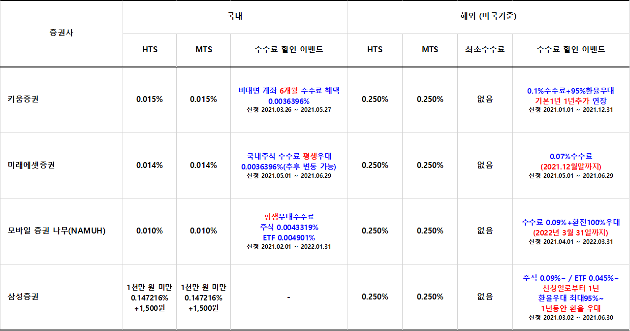 증권사별 수수료, 이벤트 비교표 (비대면계좌기준) / 2021.05