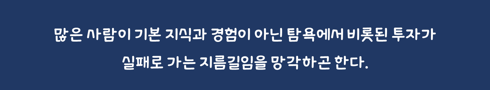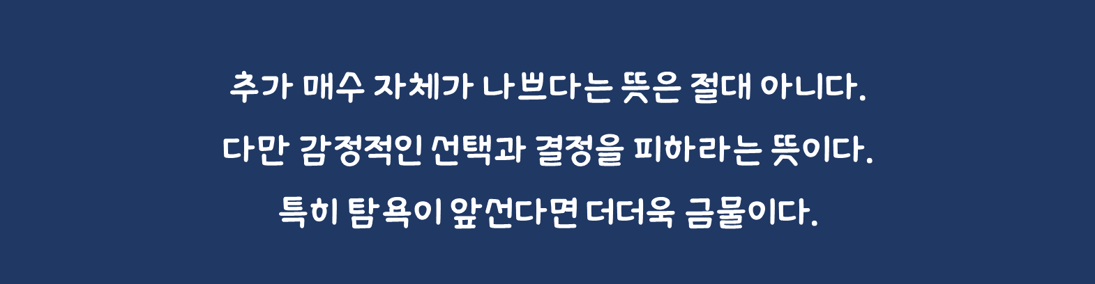 추가 매수 자체가 나쁘다는 뜻은 절대 아니다. 다만 감정적인 선택과 결정을 피하라는 뜻이다. 특히 탐욕이 앞선다면 더더욱 금물이다. 탐욕에 빠졌는지는 자신이 가장 잘 알 것이다. 나 역시 탐욕에 빠졌던 경험이 있기에 더 자신 있게 말할 수 있다. 어떤 이유로도 탐욕을 포장하려 하지 말라.