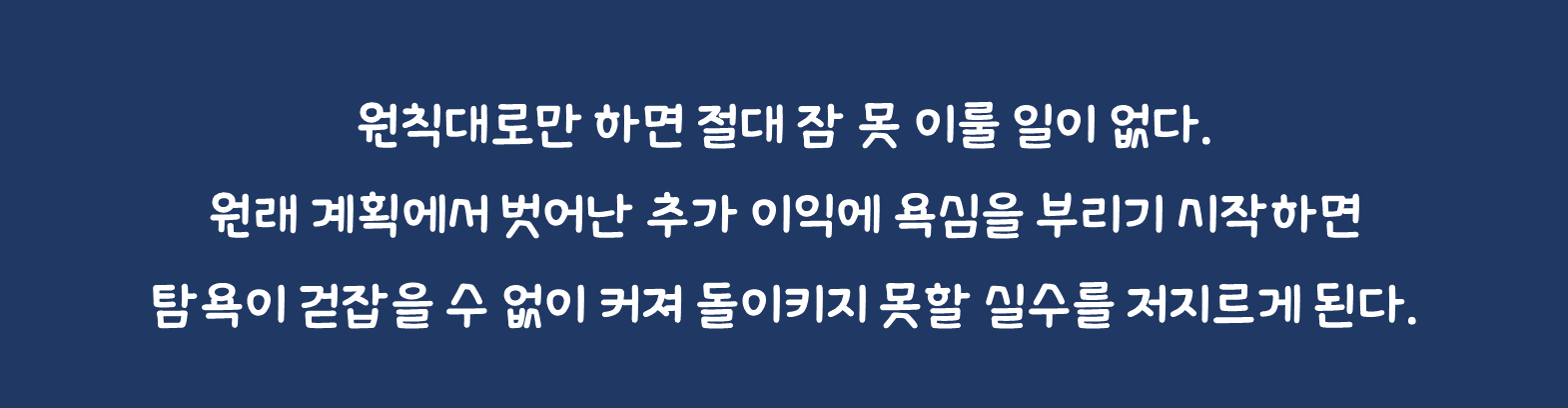 결국 우리는 다시 원칙으로 돌아가야 한다. 원래 투자 계획이 300주였고 미리 정해둔 추가 매수 지점이 있다면 추가 매수해도 좋다. 그러나 추세가 바뀌거나 위험 신호가 감지되면 바로 발을 빼야 한다. 원칙대로만 하면 절대 잠 못 이룰 일이 없다. 원래 계획에서 벗어난 추가 이익에 욕심을 부리기 시작하면 탐욕이 걷잡을 수 없이 커져 돌이키지 못할 실수를 저지르게 된다.