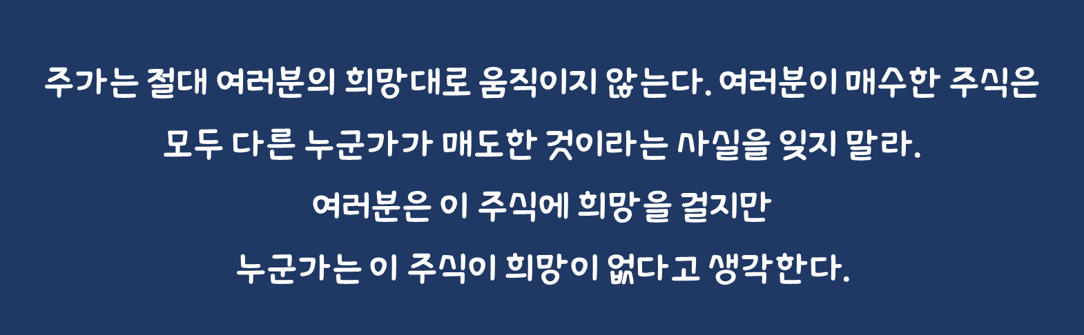 주가는 절대 여러분의 희망대로 움직이지 않는다. 여러분이 매수한 주식은 모두 다른 누군가가 매도한 것이라는 사실을 잊지 말라. 여러분은 이 주식에 희망을 걸지만 누군가는 이 주식이 희망이 없다고 생각한다. 주식시장은 나를 편애할 것이라는 기대도 절대 금물이다. 그래야 할 이유가 전혀 없으니 말이다.