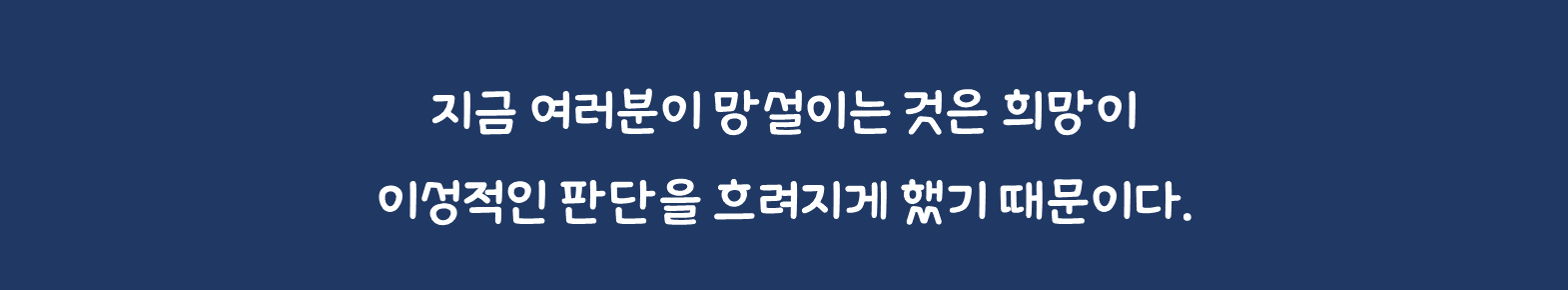 희망이란 어떤 사물에 대한 기대를 의미한다. 주식투자에 성공하려면 현재, 그리고 미래에 발생할 일들이 주가에 끼칠 영향을 이성적으로 판단해야 한다. 희망은 이 판단 과정에서 반드시 배제해야 하는 요소다.