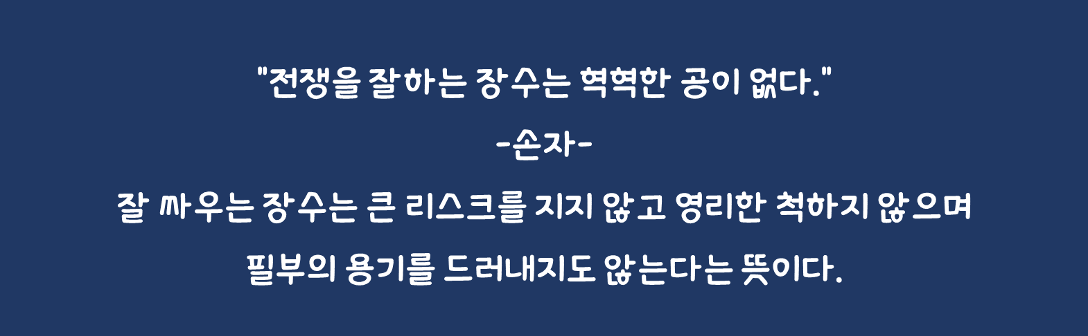 손자는 "전쟁을 잘하는 장수는 혁혁한 공이 없다. 전쟁을 잘하는 장수의 전투는 비범한 승리가 없고 지모로 쌓은 명성이 없으며 용감하게 세운 공로도 없다!"고 말했다.