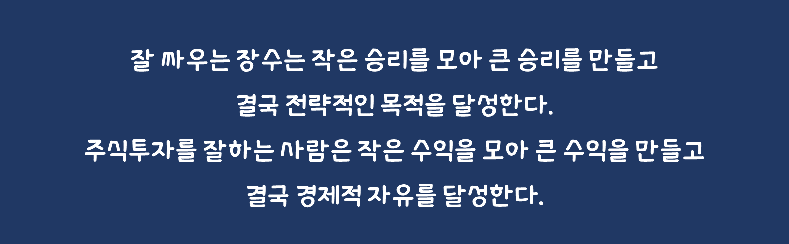 주식시장에서 한 번에 100%를 벌고자 하면 한 번에 80% 손실 볼 준비도 해야 한다. 주식을 잘하는 사람은 한 번에 크게 베팅해서 원금을 배로 불리려고 하는 대신, 손실을 보지 않는 상황에서 투자금을 늘리려고 노력한다. 잘 싸우는 장수는 작은 승리를 모아 큰 승리를 만들고 결국 전략적인 목적을 달성한다. 주식투자를 잘하는 사람은 작은 수익을 모아 큰 수익을 만들고 결국 경제적 자유를 달성한다. 길은 다르지만 이르는 곳은 같다. 이는 내가 여러 해 동안 전업 투자를 하며 막대한 대가를 치르고 나서야 깨달은 교훈이다.