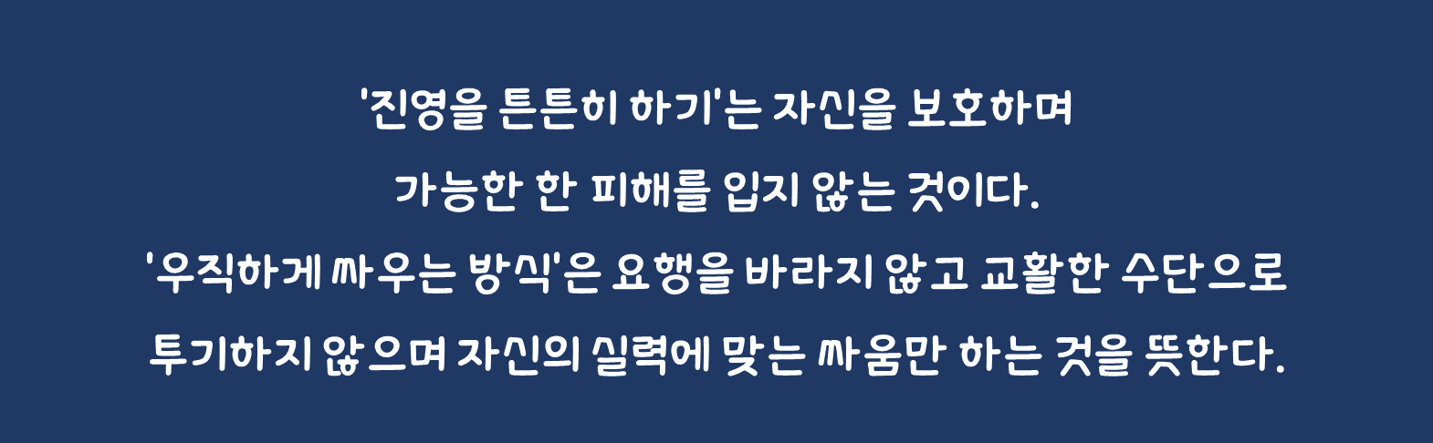 당시는 백수십 년 전의 일이어서 증국번이 저녁에 뭘 먹었는지도 남아 있을 정도로 기록이 완벽하다. 하지만 역사가들은 증국번이 대승을 거둔 기록을 아무리 뒤져도 찾을 수가 없었다. 증국번은 '진영을 튼튼히 하고 우직하게 싸우는' 방식으로 작은 승리를 거듭해 대승을 거두며 태평천국군을 막다른 길로 몰아갔다. '진영을 튼튼히 하기'는 참호를 깊게 파고 보루를 높게 쌓아서 자신을 보호하며 가능한 한 피해를 입지 않는 것이다. '우직하게 싸우는 방식'은 요행을 바라지 않고 교활한 수단으로 투기하지 않으며 자신의 실력에 맞는 싸움만 하는 것을 뜻한다.