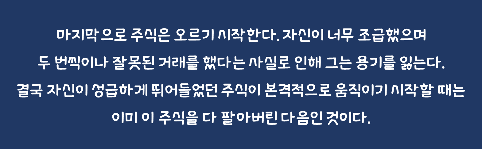 그는 또 한 번 자기 판단에 회의를 품으면서 주식을 팔아버리고 만다. 마지막으로 주식은 오르기 시작한다. 자신이 너무 조급했으며 두 번씩이나 잘못된 거래를 했다는 사실로 인해 그는 용기를 잃는다. 그는 이미 다른 종목을 거래하기 시작해 이 주식에는 더 이상 눈을 돌릴 여유가 없을지도 모른다. 결국 자신이 성급하게 뛰어들었던 주식이 본격적으로 움직이기 시작할 때는 이미 이 주식을 다 팔아버린 다음인 것이다.