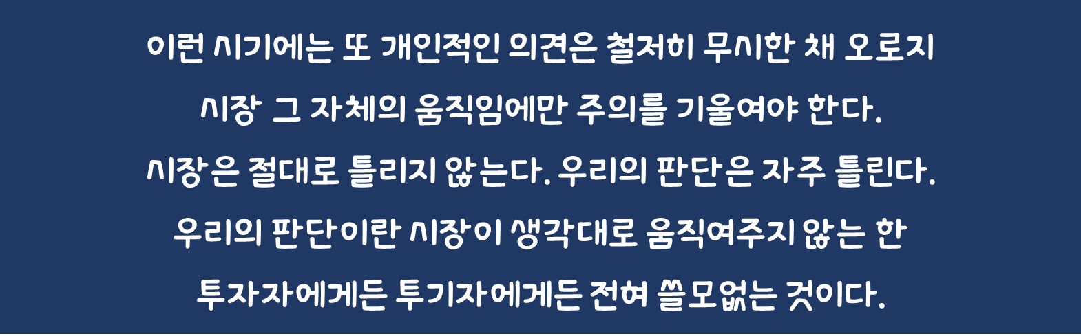 이런 시기에는 또 개인적인 의견은 철저히 무시한 채 오로지 시장 그 자체의 움직임에만 주의를 기울여야 한다. 시장은 절대로 틀리지 않는다. 우리의 판단은 자주 틀린다. 우리의 판단이란 시장이 생각대로 움직여주지 않는 한 투자자에게든 투기자에게든 전혀 쓸모없는 것이다. 아무도, 아니 어떤 세력도 오늘 시장을 만들어낼 수 없고 무너뜨릴 수도 없다.