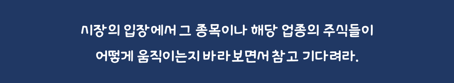 내가 여기서 강조하고자 하는 요지는 특정 종목이나 특정 업종의 주식에 관해 분명한 견해를 갖게 됐다 하더라도 그 주식을 거래하지 못해 너무 초조해하는 것은 금물이라는 점이다. 시장의 입장에서 그 종목이나 해당 업종의 주식들이 어떻게 움직이는지 바라보면서 참고 기다려라.