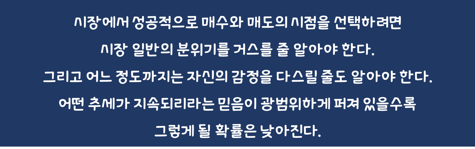 주가가 꼭짓점까지 치솟았을 때 시장의 미래에 대한 설득력 있는 장밋빛 주장이 만연하며, 반대로 주가가 바닥일 때 비관적 주장이 넘쳐나곤 한다. 또한 우리 대부분은 낙관주의 혹은 비관주의적 편향을 타고 나게 마련이다. 따라서 낙관주의자(타고난 상승론자)는 매도보다는 매수를, 비관주의자(타고난 하락론자)는 매수보다는 매도를 선호하게 된다. 시장에서 성공적으로 매수와 매도의 시점을 선택하려면 시장 일반의 분위기를 거스를 줄 알아야 한다. 그리고 어느 정도까지는 자신의 감정을 다스릴 줄도 알아야 한다. 어떤 추세가 지속되리라는 믿음이 광범위하게 퍼져 있을수록 그렇게 될 확률은 낮아진다. 프로들을 하나의 그룹으로 묶어 봤을 때 시장에서 매수와 매도의 시점을 선택하는 데 상당히 좋지 않은 성적을 내고 있었다(이는 어쩌면 당연한 일이다. 대다수가 정확할 수는 없기 때문이다). 또한 시장은 결국 다수를 틀리게 만드는 방향으로 움직이곤 한다.