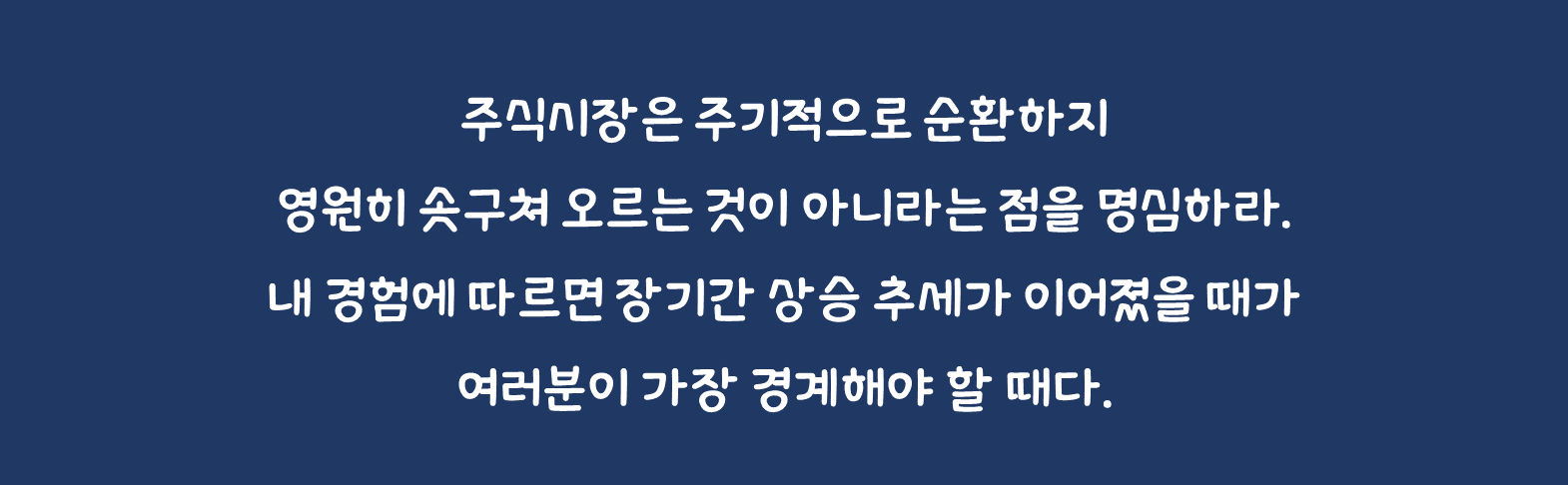 주식시장은 주기적으로 순환하지 영원히 솟구쳐 오르는 것이 아니라는 점을 명심하라. 오랫동안 이어진 상승장 때문에 내가 조심스런 입장을 취하면 다른 사람들은 투자 환경이 아직도 양호해 보인다고 말한다. 내 경험에 따르면 장기간 상승 추세가 이어졌을 때가 여러분이 가장 경계해야 할 때다. 전망이 여전히 양호해 보인다고 해도 말이다. 문제는 전망이 어떻게 보이느냐가 아니라 주가가 어떻게 될 것 같으냐는 점이다.