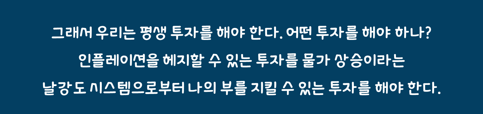 그래서 우리는 평생 투자를 해야 한다. 어떤 투자를 해야 하나? 인플레이션을 헤지할 수 있는 투자를 물가 상승이라는 날강도 시스템으로부터 나의 부를 지킬 수 있는 투자를 해야 한다. 부동산 투자와 주식투자는 '선택'이 아니라 '필수'다. 이 두 가지 투자를 하지 않고 열심히 착실하게 일하는 것은 우리 집 대문을 활짝 열어놓고 출근하는 거나 마찬가지다.