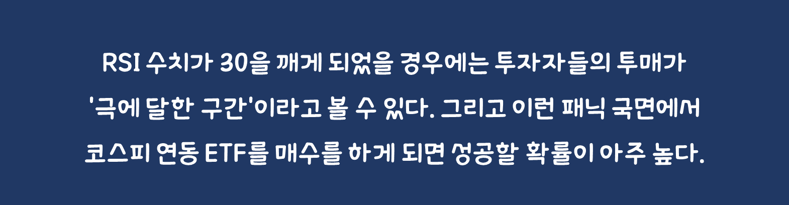 RSI 수치가 30을 깨게 되었을 경우에는 투자자들의 투매가 '극에 달한 구간'이라고 볼 수 있다. 그리고 이런 패닉 국면에서 코스피 연동 ETF를 매수를 하게 되면 성공할 확률이 아주 높다.