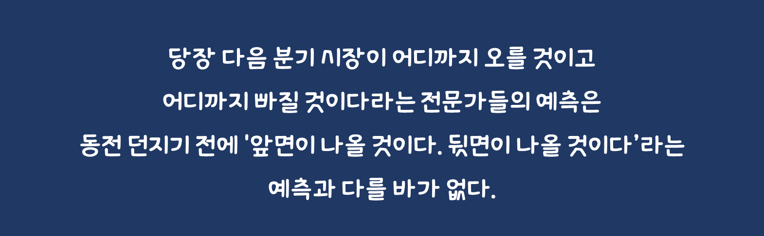 우리가 투자자들의 탐욕과 공포감이 어디까지 확산될지 미리 예측할 수 있는 방법은 없다. 그동안 수많은 석학들과 투자자들이 이를 예측하려고 노력했으나, 애석하게도 그런 툴 Tool은 존재하지 않았다. 만약 그런 툴이 설사 발명되었다고 하더라도, 그 툴을 아는 투자자들은 그 정점보다 한 발 빨리 액션을 하려고 할 것이기 때문에 그 툴은 다시 맞지 않게 될 것이다. 그래서 GDP나 주식시장의 장기 평균성장률을 가지고 지수가 장기적으로 어디까지 오를 것이다는 예측은 타당성이 있지만, 당장 다음 분기 시장이 어디까지 오를 것이고 어디까지 빠질 것이다라는 전문가들의 예측은 동전 던지기 전에 '앞면이 나올 것이다. 뒷면이 나올 것이다'라는 예측과 다를 바가 없다.
