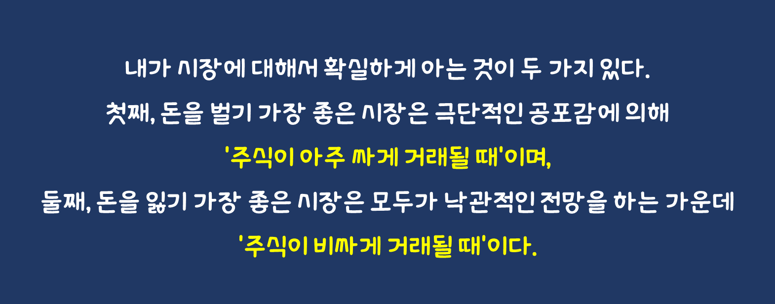 많은 주식의 대가들이 시장은 알 수 없다고 이야기했다. 필자 역시 2020년 상반기 코스피가 1,500 포인트까지 깨질 것이라고는 꿈에서도 예상 못했다. 그리고 이번 상승장이 언제, 또 어디까지 진행될지 알지 못한다. 하지만 내가 시장에 대해서 확실하게 아는 것이 두 가지 있다. 첫째, 돈을 벌기 가장 좋은 시장은 극단적인 공포감에 의해 '주식이 아주 싸게 거래될 때'이며, 둘째, 돈을 잃기 가장 좋은 시장은 모두가 낙관적인 전망을 하는 가운데 '주식이 비싸게 거래될 때'이다.