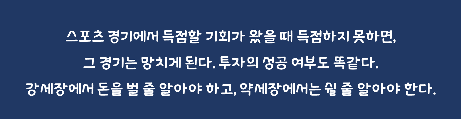 스포츠 경기에서 득점할 기회가 왔을 때 득점하지 못하면, 그 경기는 망치게 된다. 투자의 성공 여부도 똑같다. 강세장에서 돈을 벌 줄 알아야 하고, 약세장에서는 쉴 줄 알아야 한다. 내 주변에 주식으로돈 번 슈퍼개미들을 보면 하나같이 강세장에서 돈을 잘 번 사람들이었다. 바람 불 때 연 날리고, 물 들어올 때 배 띄워서 고기 잡은 사람들이었다.