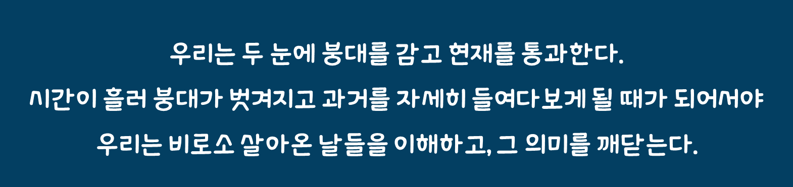 우리는 두 눈에 붕대를 감고 현재를 통과한다. 시간이 흘러 붕대가 벗겨지고 과거를 자세히 들여다보게 될 때가 되어서야 우리는 비로소 살아온 날들을 이해하고, 그 의미를 깨닫는다.- 밀란 쿤데라