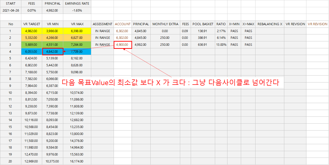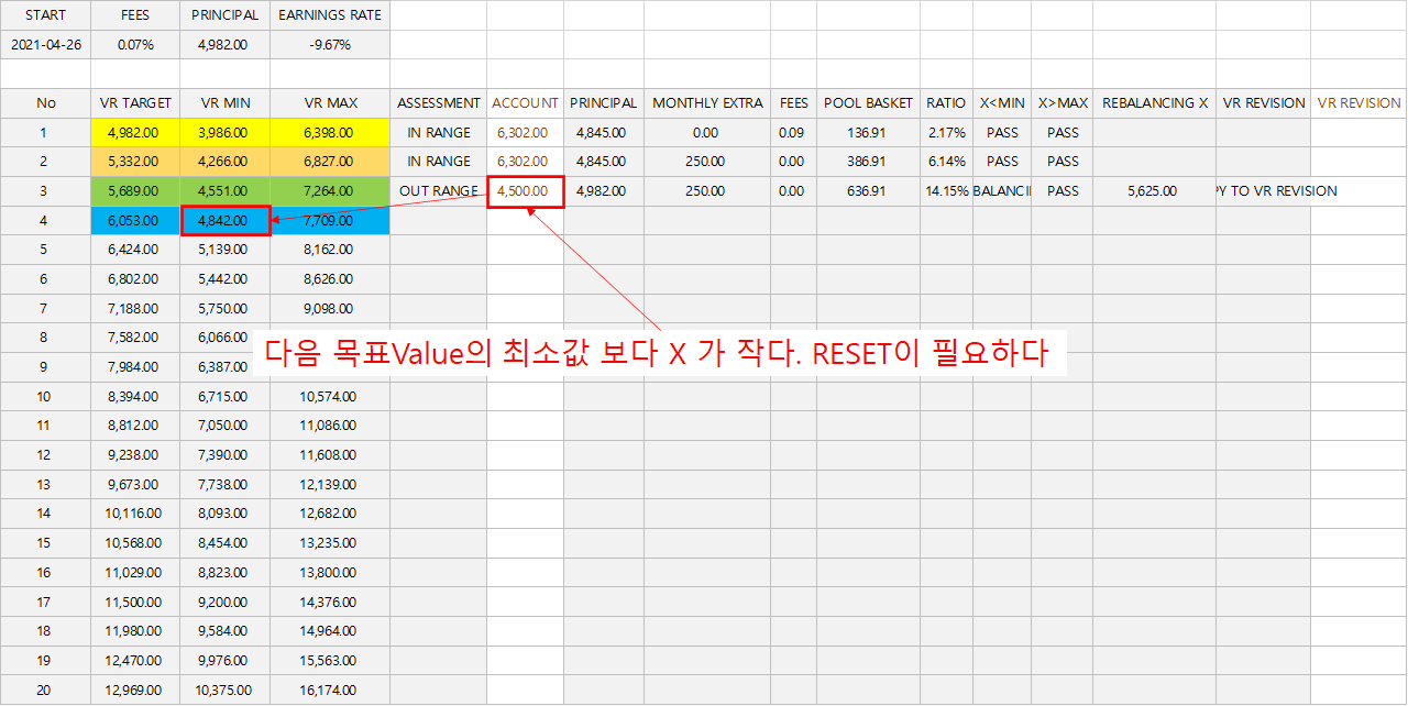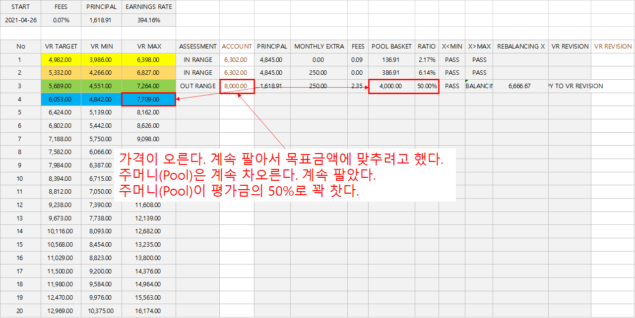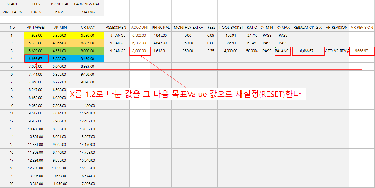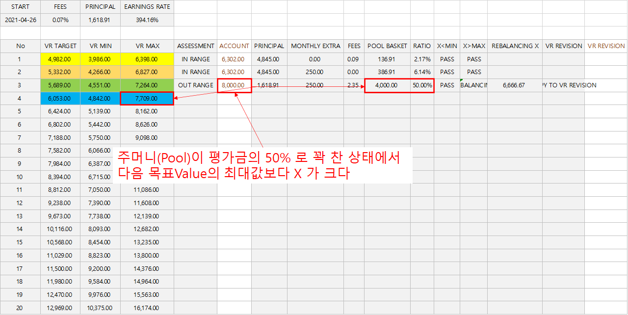3. 주머니(Pool)가 평가금의 50% 로 꽉 찬 상태에서 다음 목표 Value의 최댓값보다 X 가 크다 : X를 1.2로 나눈 값을 그다음 목표 Value 값으로 재설정(RESET)한다