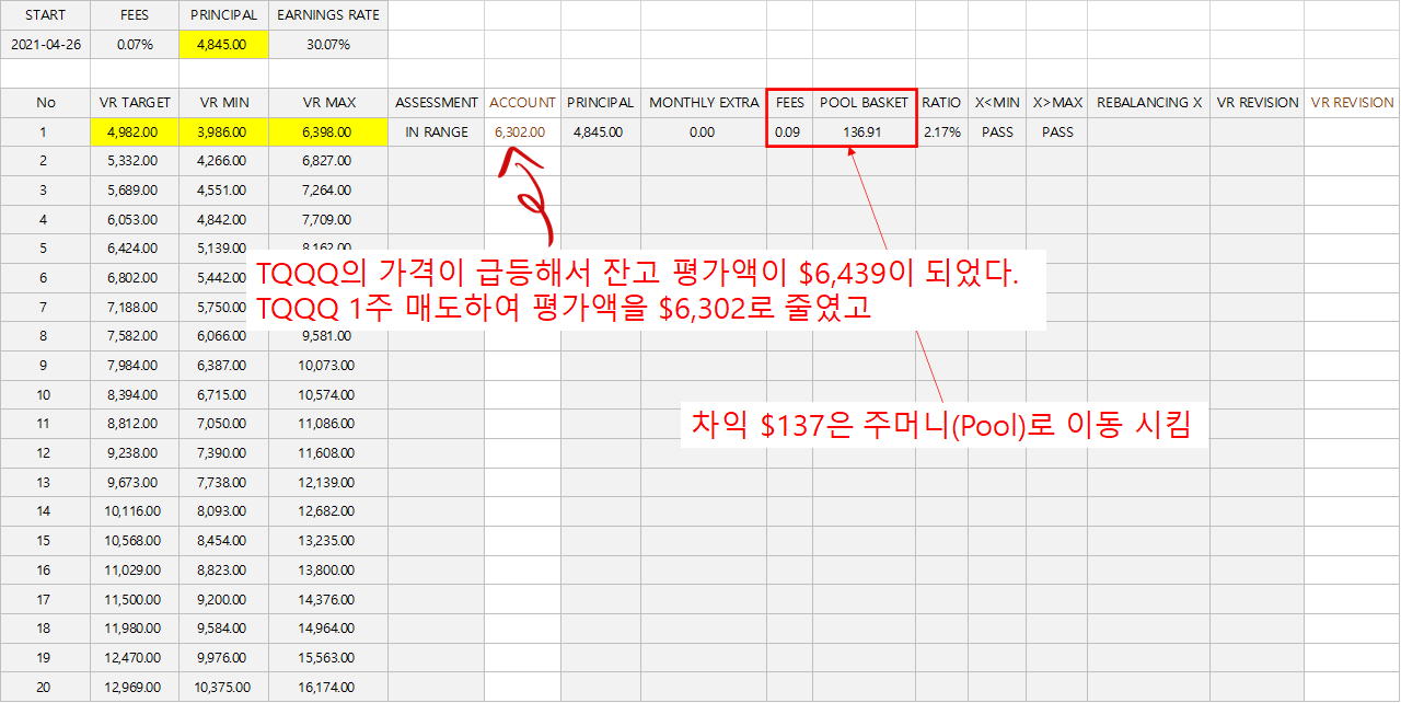 TQQQ의 가격이 급등해서 잔고 평가액이 $6,439이 되었다. TQQQ 1주 매도하여 평가액을 $6,302로 줄였고 차익 $137은 주머니(Pool)로 이동 시킴