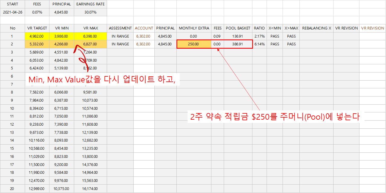 4. 2주 후 Min, Max Value값을 다시 업데이트하고, 2주 약속 적립금 $250를 주머니(Pool)에 넣는다