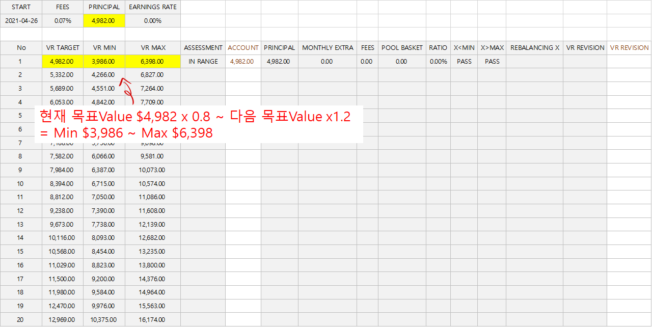 현재 목표 Value $4,982 x 0.8 ~ 다음 목표 Value x1.2 = Min $3,986 ~ Max $6,398
