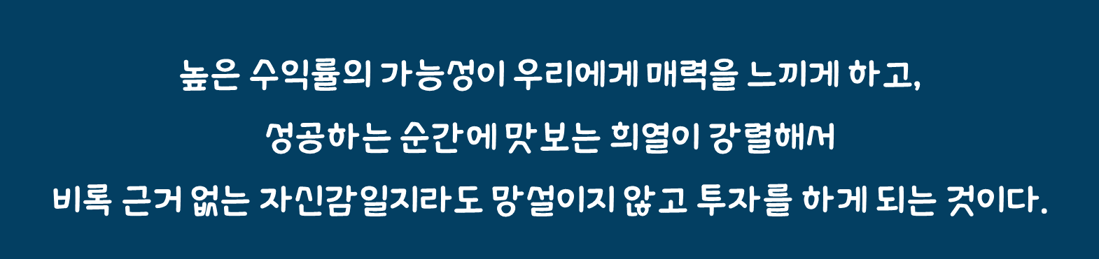 실패를 경험하고 위험하다는 생각을 하면서도 우리가 투자를 계속하는 이유는 무엇일까? 아마도 주변에서 벌어지는 각종 변화와 사람들의 기대감 속에서 발생하는 '높은 수익률' 때문일 것이다. 높은 수익률의 가능성이 우리에게 매력을 느끼게 하고, 성공하는 순간에 맛보는 희열이 강렬해서 비록 근거 없는 자신감일지라도 망설이지 않고 투자를 하게 되는 것이다.