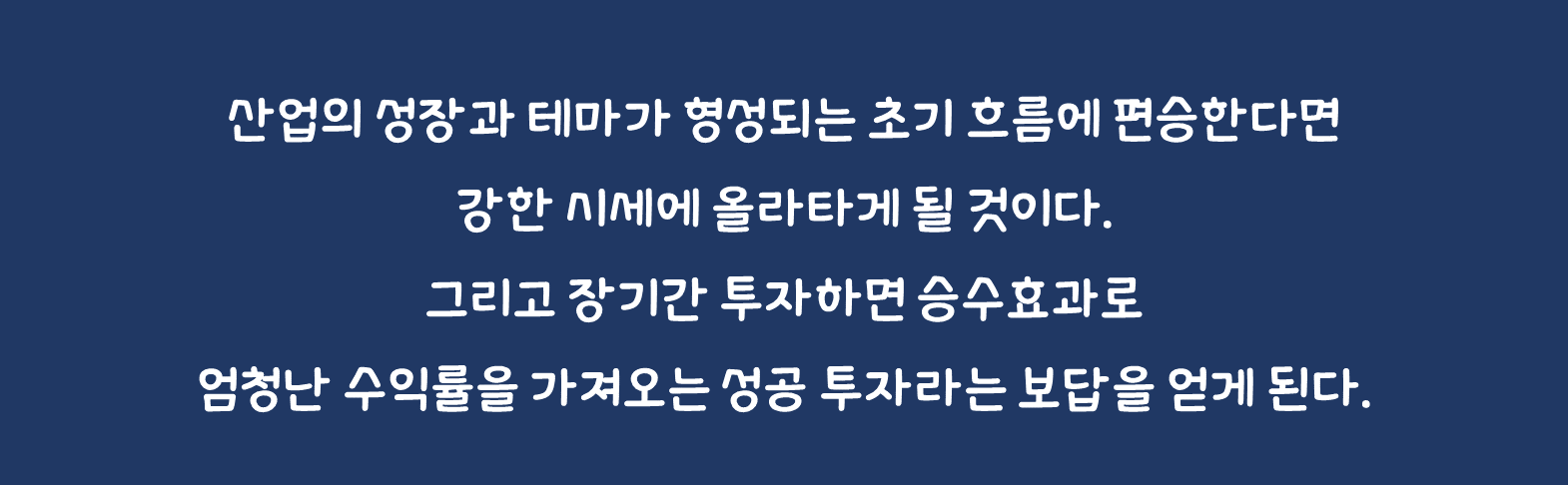그리고 산업의 성장과 테마가 형성되는 초기 흐름에 편승한다면 강한 시세에 올라타게 될 것이다. 그러면 안전마진을 확보한 상태로 투자를 시작하기 때문에 조그마한 변동성은 가뿐히 견딜 수 있게 되면서 자연스럽게 장기 투자로 이어진다. 그리고 장기간 투자하면 승수효과로 엄청난 수익률을 가져오는 성공 투자라는 보답을 얻게 된다.