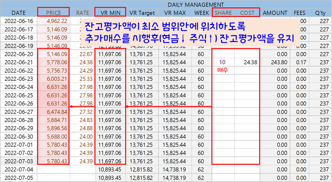 주머니(Pool)를 별도 하나 만들어 두고 매월 일정 금액을 꾸준히 주머니(Pool)에 적립하고, 평가액이 목표 value보다 낮으면 주머니(Pool)에서 투자금을 꺼내 추가 매수하여 목표 value에 맞추고, 반대로 평가액이 목표 value보다 크다면 일부 매도하여 목표 value에 맞춤과 동시에 수익은 주머니(Pool)에 다시 넣어두고 추후 매수에 사용할 수 있도록 여력을 비축하는 거였어요.
