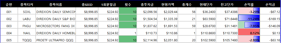 1) SOXL, LABU, FNGU, NAIL, TQQQ 5개의 레버리지 ETF로 시작했습니다