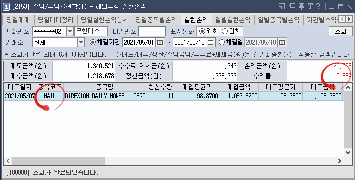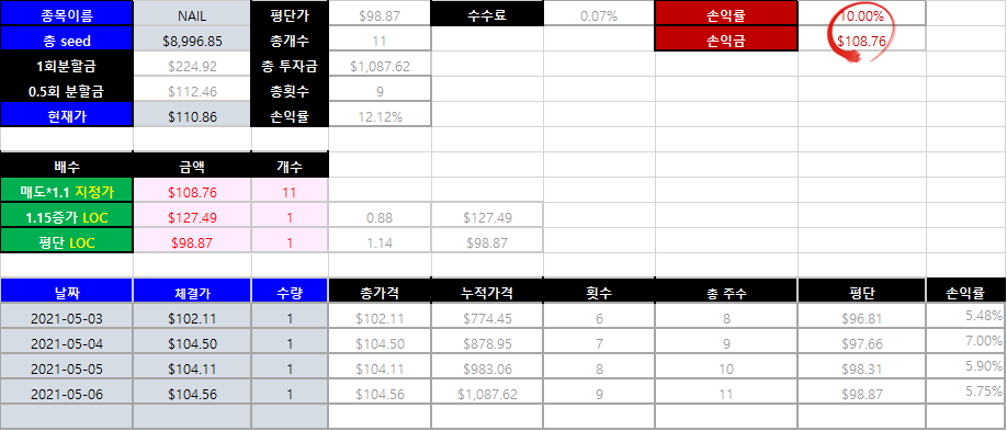 2) NAIL은 10회 차에 매도되어 10% 수익률을 가졌고, 동시에 LOC매수가 이루어져 새로운 1회 차로 자연스럽게 이어졌습니다
