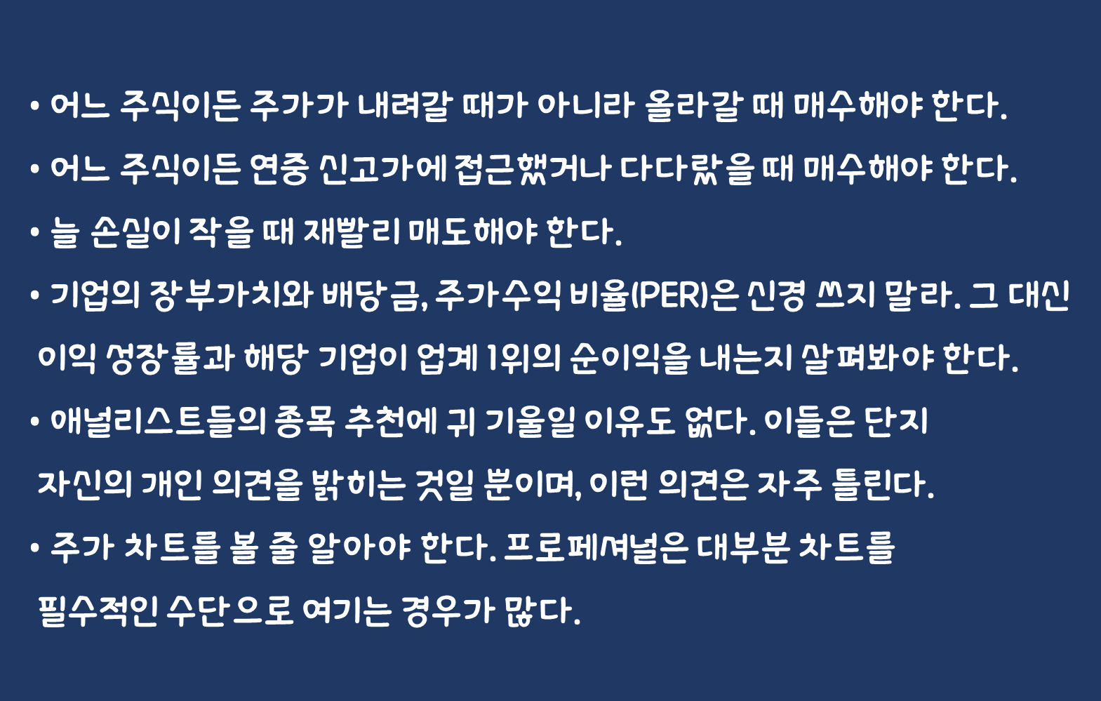 • 어느 주식이든 주가가 내려갈 때가 아니라 올라갈 때 매수해야 한다. 추가 매수는 앞선 매수 가격보다 상승했을 때 해야지 하락했을 때 해서는 안 된다.