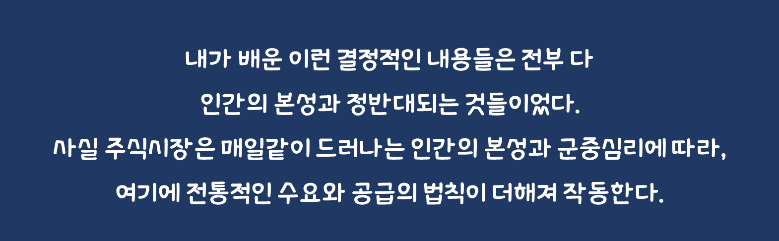 내가 배운 이런 결정적인 내용들은 전부 다 인간의 본성과 정반대되는 것들이었다. 사실 주식시장은 매일같이 드러나는 인간의 본성과 군중심리에 따라, 여기에 전통적인 수요와 공급의 법칙이 더해져 작동한다. 이런 요인들은 시간이 흘러도 변하지 않기 때문에 주가 패턴은 참으로 기가 막힐 정도로 50년 전이나 100년 전처럼 똑같이 나타나는 것이다. 이런 사실을 아는 투자자는 거의 없다. 따라서 당신은 이것을 경쟁 우위 요소로 만들 수 있다.