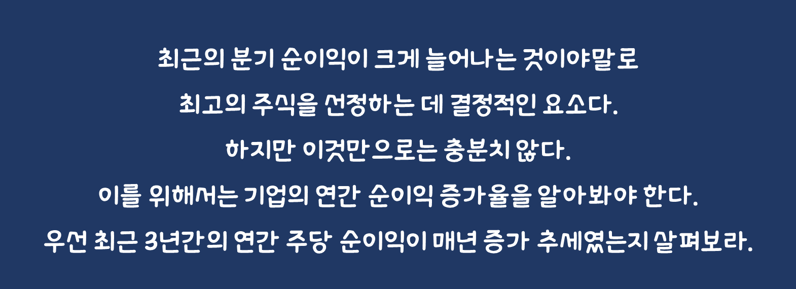 우선 최근 3년간의 연간 주당 순이익이 매년 증가 추세였는지 살펴보라. 비록 최근의 연간 순이익이 전년도보다 나아져 사상 최고치를 기록했다 하더라도, 전년도의 순이익이 그 전 해보다 줄어들었었다면 선뜻 손이 나가지 않을 것이다. 최고의 주식이 되기 위해서는, 적어도 성공할가능성이 높은 주식이 되려면 최근 분기 순이익이 아주 뛰어날 뿐만 아니라 연간 순이익 증가율도 돋보여야 한다.