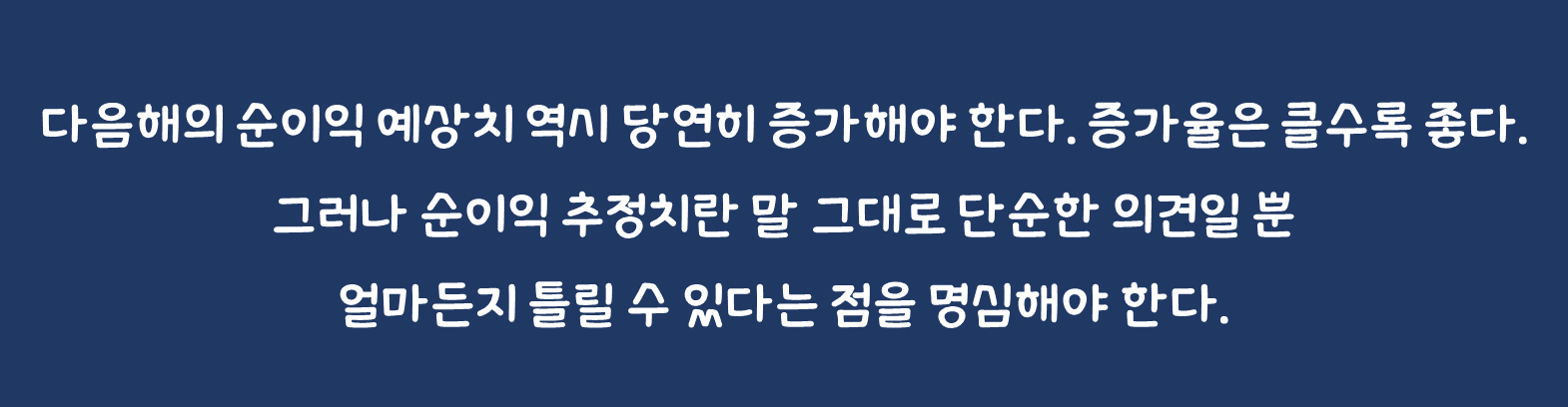 다음해의 순이익 예상치 역시 당연히 증가해야 한다. 증가율은 클수록 좋다. 그러나 순이익 추정치란 말 그대로 단순한 의견일 뿐 얼마든지 틀릴 수 있다는 점을 명심해야 한다. 실적 보고서를 통해 실제로 발표되는 순이익만이 사실이다.