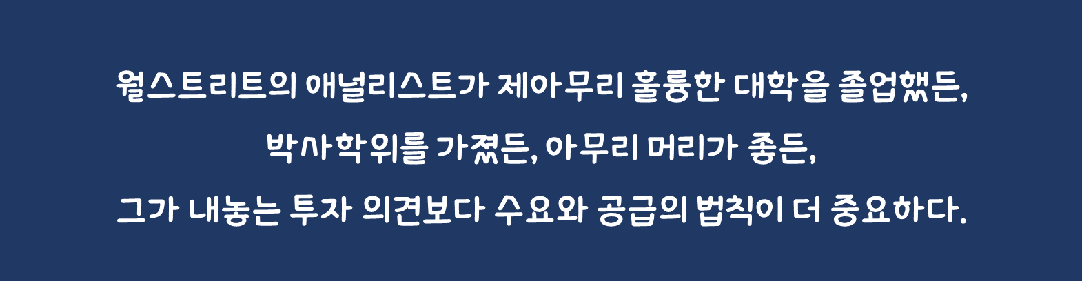 수요와 공급이라는 이 같은 기본 원칙은 주식시장에도 그대로 적용된다. 월스트리트의 애널리스트가 제아무리 훌륭한 대학을 졸업했든, 박사학위를 가졌든, 아무리 머리가 좋든, 그가 내놓는 투자 의견보다 수요와 공급의 법칙이 더 중요하다.