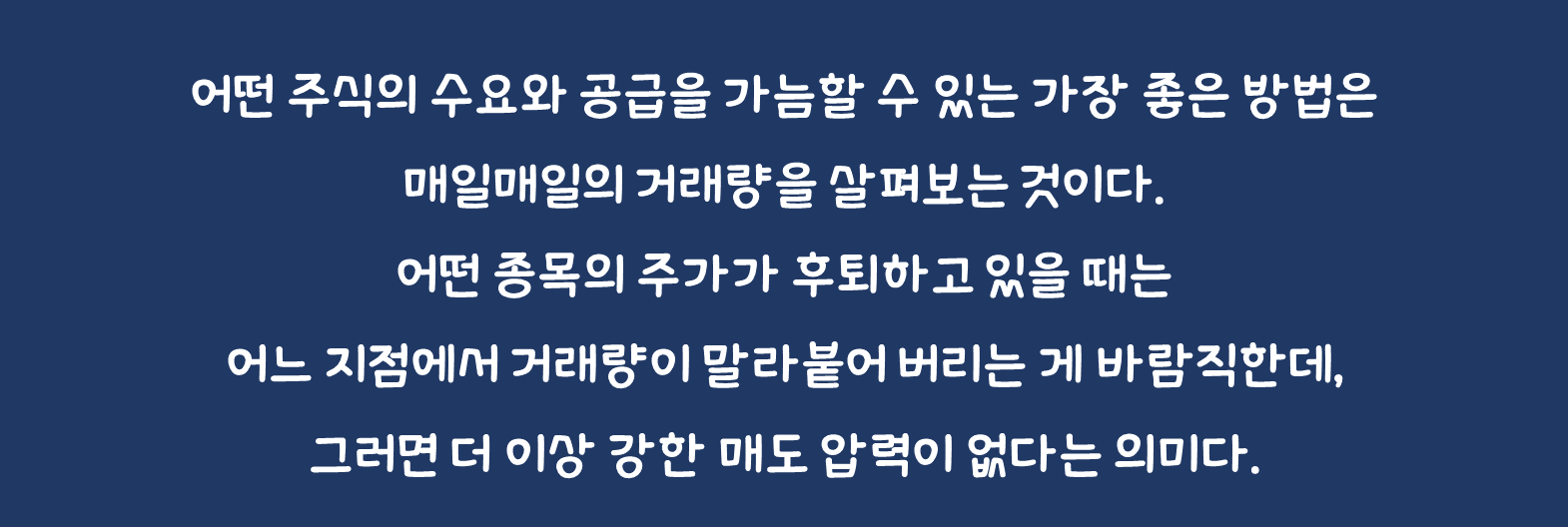 어떤 주식의 수요와 공급을 가늠할 수 있는 가장 좋은 방법은 매일매일의 거래량을 살펴보는 것이다. 어떤 종목의 주가가 후퇴하고 있을 때는 어느 지점에서 거래량이 말라붙어 버리는 게 바람직한데, 그러면 더 이상 강한 매도 압력이 없다는 의미다. 주가가 상승세를 탈 때는 거래량이 증가하는 게 좋은데, 이는 대개 개인 투자자가 아닌 기관투자가의 매수를 반영하는 것이다.