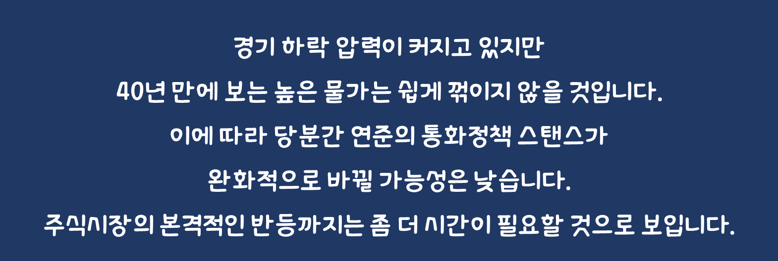 경기 하락 압력이 커지고 있지만 40년 만에 보는 높은 물가는 쉽게 꺾이지 않을 것입니다. 이에 따라 당분간 연준의 통화정책 스탠스가 완화적으로 바뀔 가능성은 낮습니다. 경기 하락 압력이 높은 가운데 달러 강세가 해외 매출이 발생하는 미국 대표 기업들의 실적에도 부정적으로 작용하고 있습니다. 주식시장의 본격적인 반등까지는 좀 더 시간이 필요할 것으로 보입니다.