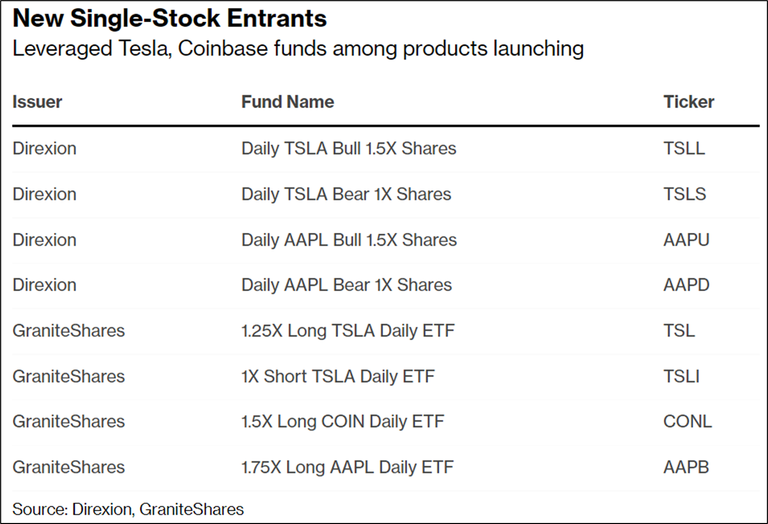GranitesShares와 Direxion 운용사의 단일 종목 레버리지/인버스 ETF 각각 4개씩 총 8개가 추가 상장되었습니다. 애플의 레버리지와 인버스도 새롭게 매매할 수 있게 되었으며, 인버스뿐이었던 테슬라 레버리지도 가능해졌네요. 변동성이 높은 주식 중 하나인 코인베이스 역시 레버리지로(1.5배) 상장되었습니다.
