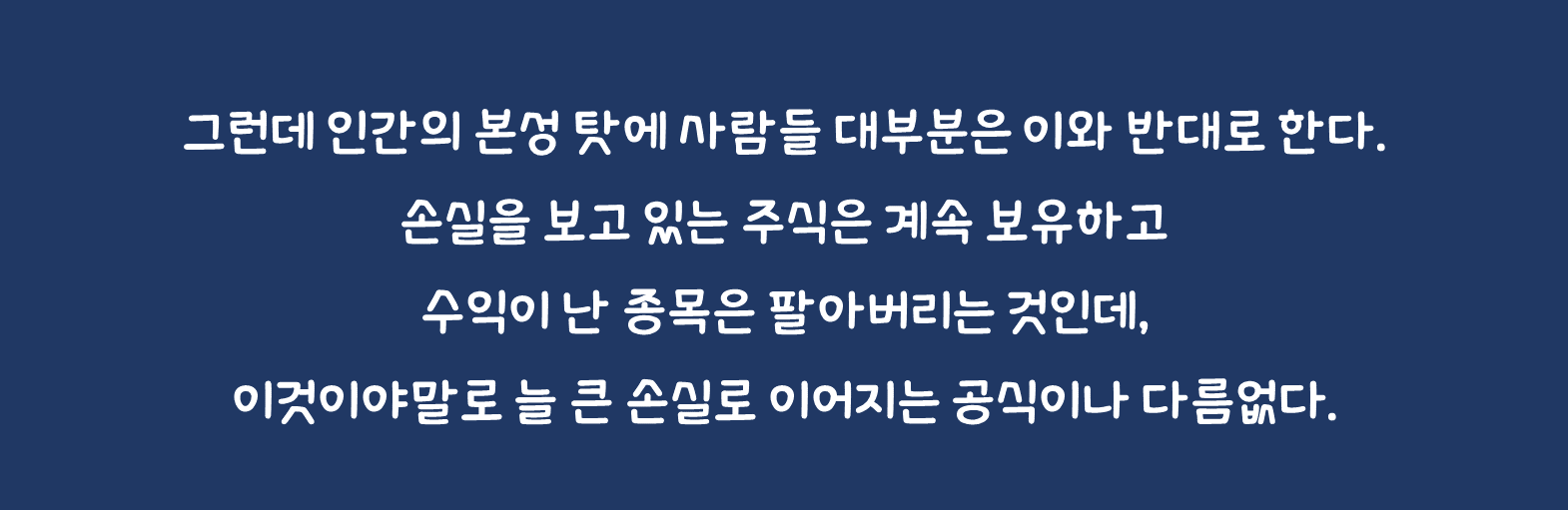 여러 주식으로 포트폴리오를 구성하고 있다면 반드시 투자 수익률이 제일 떨어지는 주식을 먼저 팔고, 수익률이 가장 좋은 주식은 좀 더 보유해야 한다. 다시 말해 당신이 실수로 산 종목은 손실이 아직 작을 때 팔아버리고, 당신이 선택을 잘 한 종목은 최고의 주식으로 커나가는지 잘 지켜보라는 것이다. 그런데 인간의 본성 탓에 사람들 대부분은 이와 반대로 한다. 손실을 보고 있는 주식은 계속 보유하고 수익이 난 종목은 팔아버리는 것인데, 이것이야말로 늘 큰 손실로 이어지는 공식이나 다름없다.