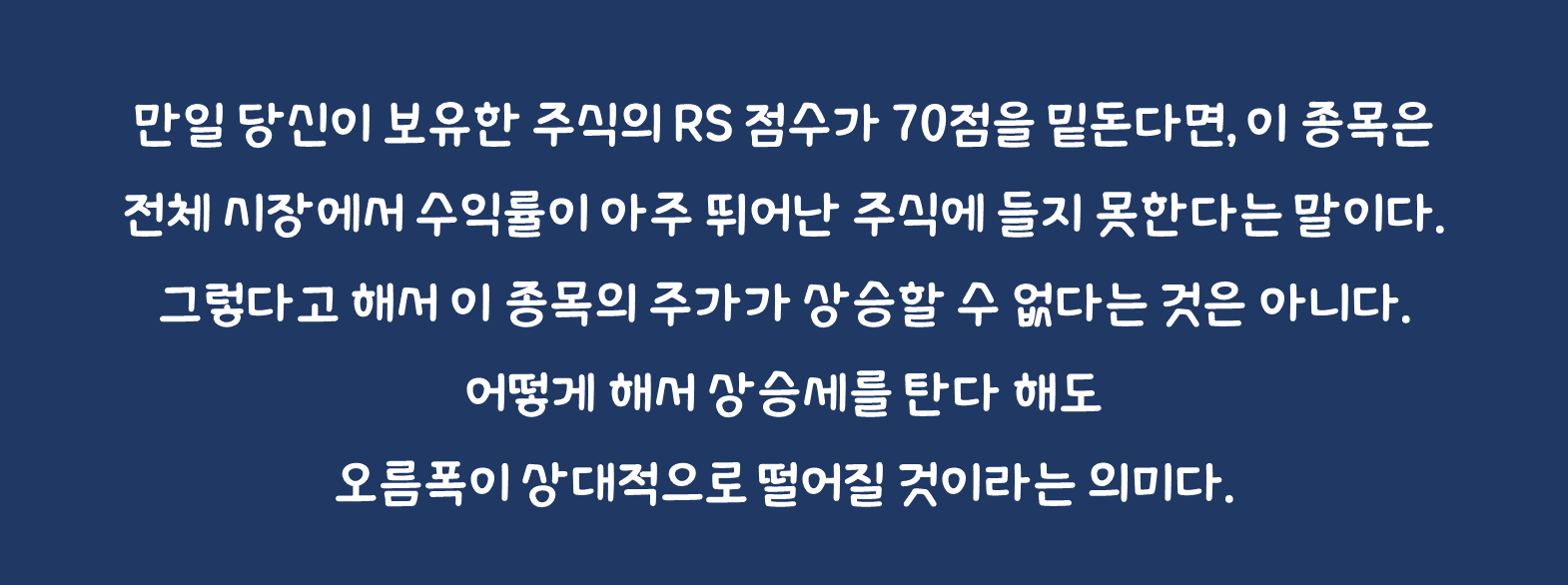 만일 당신이 보유한 주식의 RS 점수가 70점을 밑돈다면, 이 종목은 전체 시장에서 수익률이 아주 뛰어난 주식에 들지 못한다는 말이다. 그렇다고 해서 이 종목의 주가가 상승할 수 없다는 것은 아니다. 어떻게 해서 상승세를 탄다 해도 오름폭이 상대적으로 떨어질 것이라는 의미다.