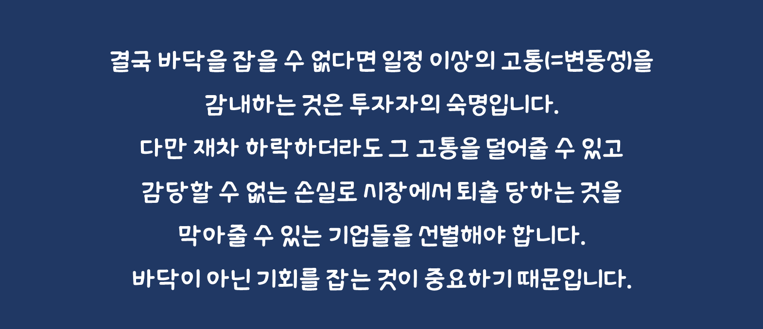 결국 바닥을 잡을 수 없다면 일정 이상의 고통(=변동성)을 감내하는 것은 투자자의 숙명입니다. 다만 재차 하락하더라도 그 고통을 덜어줄 수 있고 감당할 수 없는 손실로 시장에서 퇴출 당하는 것을 막아줄 수 있는 기업들을 선별해야 합니다. 바닥이 아닌 기회를 잡는 것이 중요하기 때문입니다.