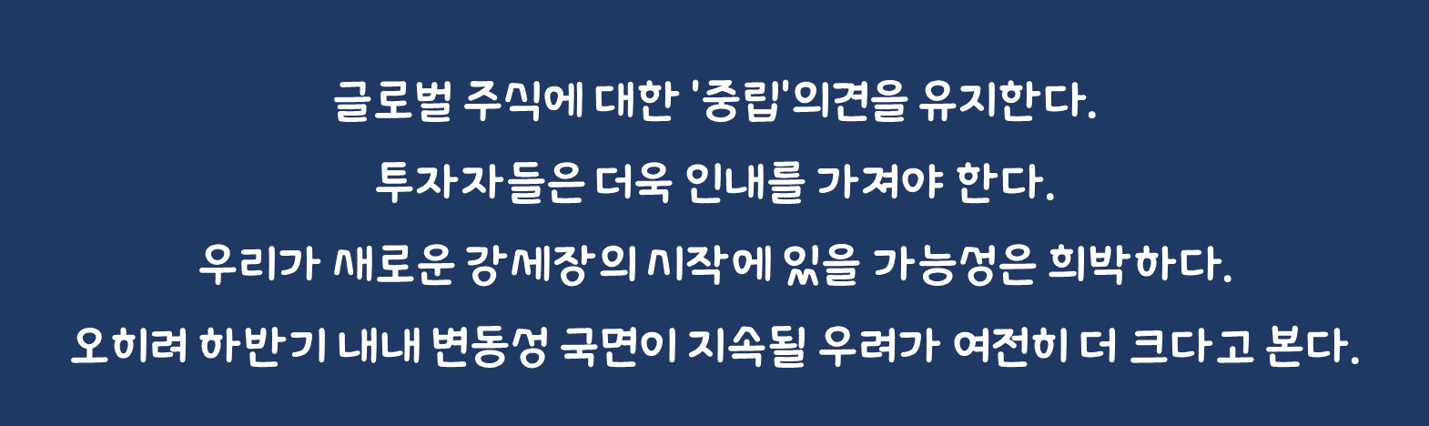 글로벌 주식에 대한 '중립'의견을 유지한다. 투자자들은 더욱 인내를 가져야 한다. 우리가 새로운 강세장의 시작에 있을 가능성은 희박하다. 오히려 하반기 내내 변동성 국면이 지속될 우려가 여전히 더 크다고 본다. 단기적으로 주식시장의 추가 반등이 시도되더라도 추격매수의 실익은 제한된다. 인덱스의 하단과 상단이 가로막힌 상황에서 당분간 지구전과 종목별 각개전투가 불가피하다.