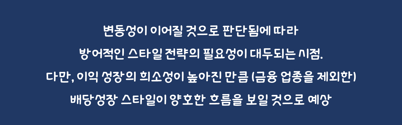 지난 잭슨홀 미팅 이후 연준의 통화정책 경로를 둘러싼 경계감이 재차 높아짐에 따라 9월 주요 이벤트 및 지표들을 확인하는과정에서 높은 변동성이 이어질 것으로 판단됨에 따라 방어적인 스타일 전략의 필요성이 대두되는 시점. 다만, 이익 성장의 희소성이 높아진 만큼 (금융 업종을 제외한) 배당성장 스타일이 양호한 흐름을 보일 것으로 예상