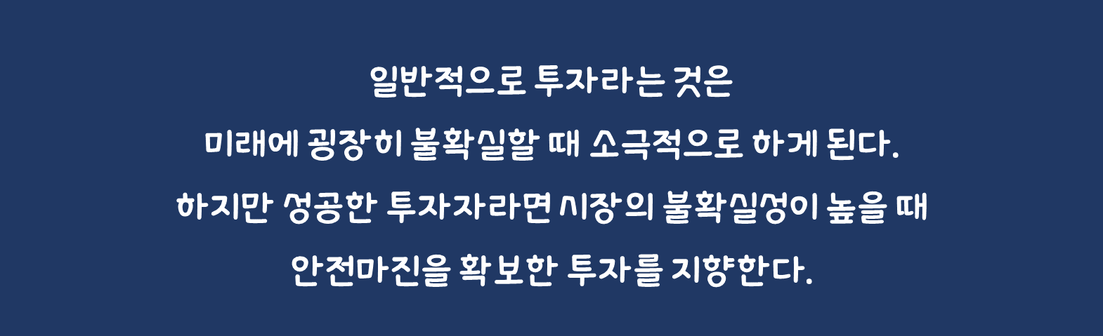 일반적으로 투자라는 것은 미래에 굉장히 불확실할 때 소극적으로 하게 된다. 하지만 성공한 투자자라면 시장의 불확실성이 높을 때 안전마진을 확보한 투자를 지향한다. 시장이 좋을 때 투자한 투자자와 시장이 안 좋은데 가격에 많은 것이 반영되었을 때 투자한 투자자의 수익률 차이가 크기 때문이다. 지금은 대다수의 경기 지표가 부진한 상황이다. 지금보다 더 안 좋은 상황이 만들어질 수도 있지만 안전마진을 확보한 투자를 할 수 있는 시기이다.