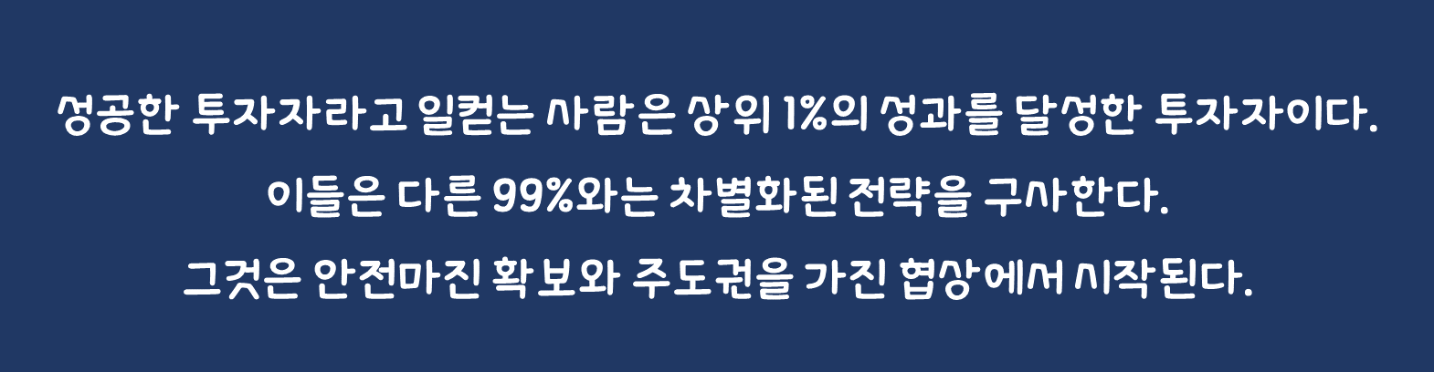 금융시장에는 많은 투자자가 있다. 그중에서 성공한 투자자라고 일컫는 사람은 상위 1%의 성과를 달성한 투자자이다. 이들은 다른 99%와는 차별화된 전략을 구사한다. 그것은 안전마진 확보와 주도권을 가진 협상에서 시작된다.