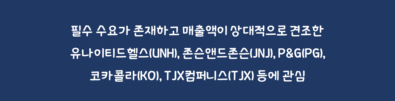 필수 수요가 존재하고 매출액이 상대적으로 견조한 유나이티드헬스(UNH), 존슨앤드존슨(JNJ), P&G(PG), 코카콜라(KO), TJX컴퍼니스(TJX) 등에 관심. 글로벌 ETF의 경우 견조한 수요가 있는 소비재(XLP), 헬스케어(XIV), 유틸리티(XIU), 방산(ITA) 등을 주목