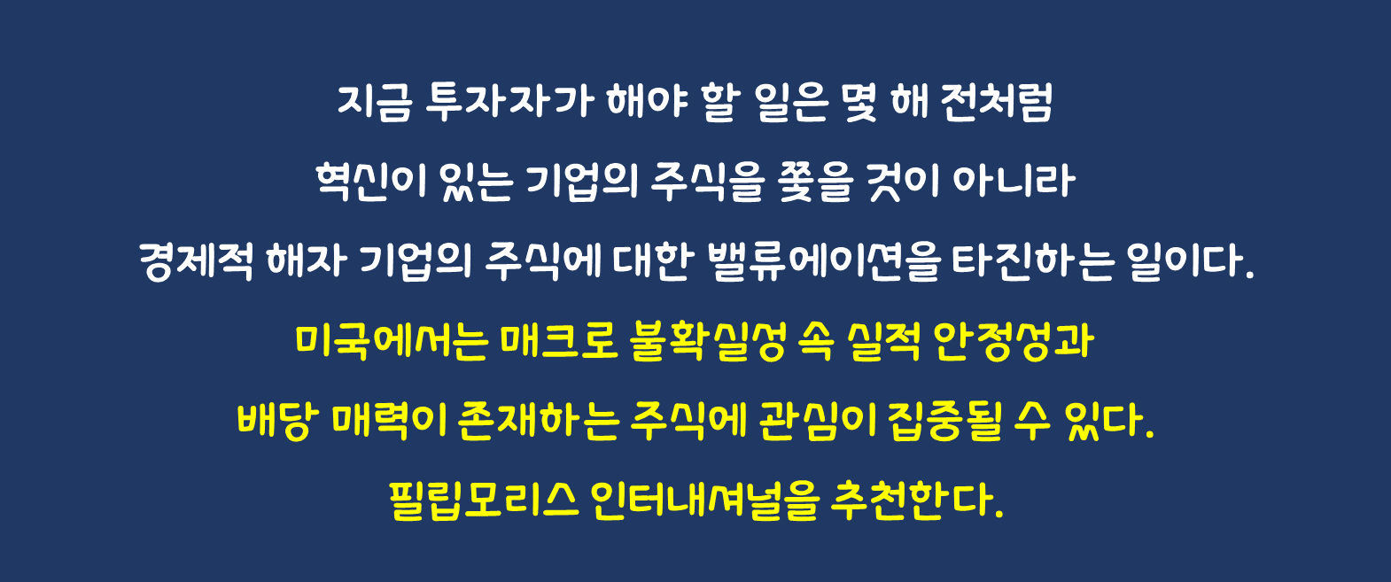 수익률 보강을 위하여 이번 가을 실행할 수 있는 단기 전술은 다음과 같다. 미국에서는 매크로 불확실성 속 실적 안정성과 배당 매력이 존재하는 주식에 관심이 집중될 수 있다. 필립모리스 인터내셔널을 추천한다.