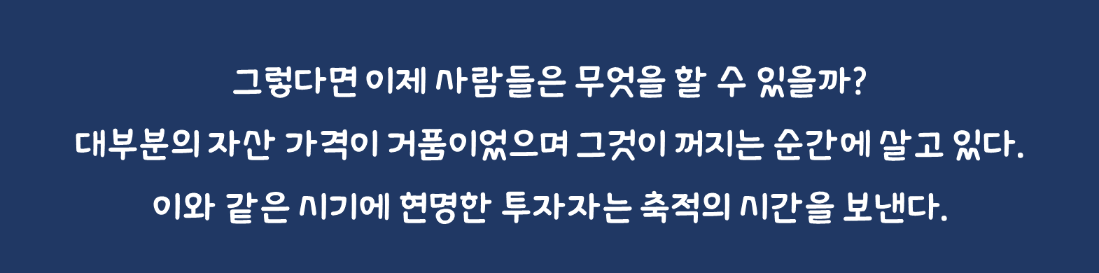 그렇다면 이제 사람들은 무엇을 할 수 있을까? 대부분의 자산 가격이 거품이었으며 그것이 꺼지는 순간에 살고 있다. 따라서 높은 물가에도 불구하고가치가 떨어지고 있는 현금을 부여잡고 있을 수밖에 없는 것이 지금의 현실이다. 다만, 이와 같은 시기에 현명한 투자자는 축적의 시간을 보낸다. 필자는 이 글을 읽는 독자 역시 이러한 시간을 보내길 바란다.