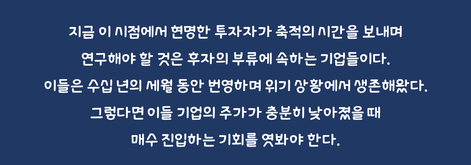 미국 주식시장의 강점은 두 가지다. 첫 번째 강점은 전 세계에서 가장 혁신적인 제품이 최초로 나타나는 곳이라는 점이다. 이들 기업의 주가는 적당한 시류를 만나면 하늘 높은 줄 모르고 오른다. 이는 얼마 전까지 모두가 목도한 바와 같다. 두 번째 강점은 전 세계에서 지배적인 위치를 오랜 기간 유지하는 기업이 존재한다는 것이다. 기본적인 먹거리에서 의류 잡화에 이르기까지 우리 생활과 맞닿은 대부분에 이들이 있다. 지금 이 시점에서 현명한 투자자가 축적의 시간을 보내며 연구해야 할 것은 후자의 부류에 속하는 기업들이다. 이들은 수십 년의 세월 동안 번영하며 위기 상황에서 생존해왔다. 그렇다면 이들 기업의 주가가 충분히 낮아졌을 때 매수 진입하는 기회를 엿봐야 한다. 필자 개인의 연구에 의하면 이처럼 경제적 해자가 굳건한 기업은 그 주가가 고점 대비 -30% 이상 내려가는 경우가 드물다. 또한 이들의 연평균 수익률은 12% 내외를 기록하는 것이 보통이다.