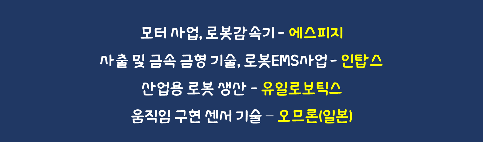 한국 기업 추천 종목으로는 모터 사업을 주축으로 로봇감속기까지 국산화하고 있는 에스피지, 사출 및 금속 금형 기술을 기반으로 로봇EMS사업 분야에 진출한 인탑스, 다양한 산업에 걸쳐 직교로봇, 협동로봇, 다관절 로봇 등 산업용 로봇을 생산하는 유일로보틱스를 추천