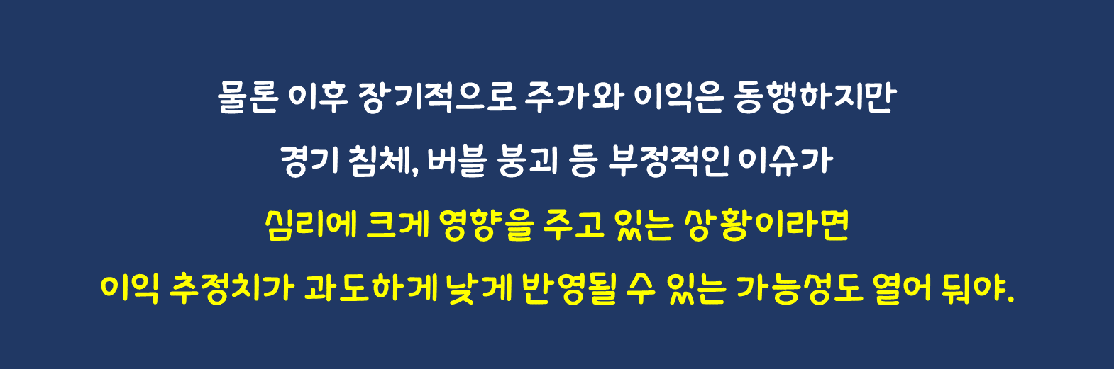 • 현재의 높은 인플레이션 환경에서 통화정책 변화 등에 따른 긍정적 멀티플 상승을 기대하긴 힘든 환경. 오히려 경기 리스크가 증가함에 따라 기업의 부정적인 이익 전망이 빠르게 반영된 반면 주가가 상대적으로 더디게 하락한 영향이 크다고 판단됨. 물론 향후 기업 이익의 추가 하락에 따라 주가가 동조할 가능성은 여전.